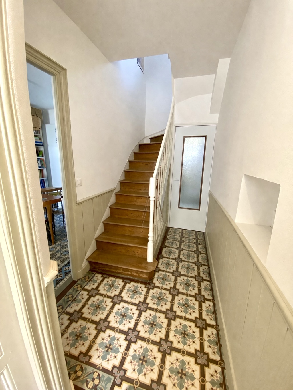 Entrée sur couloir, salon parqueté, séjour sur carreaux de ciment, cuisine équipée et aménagée, salle de bain et WC